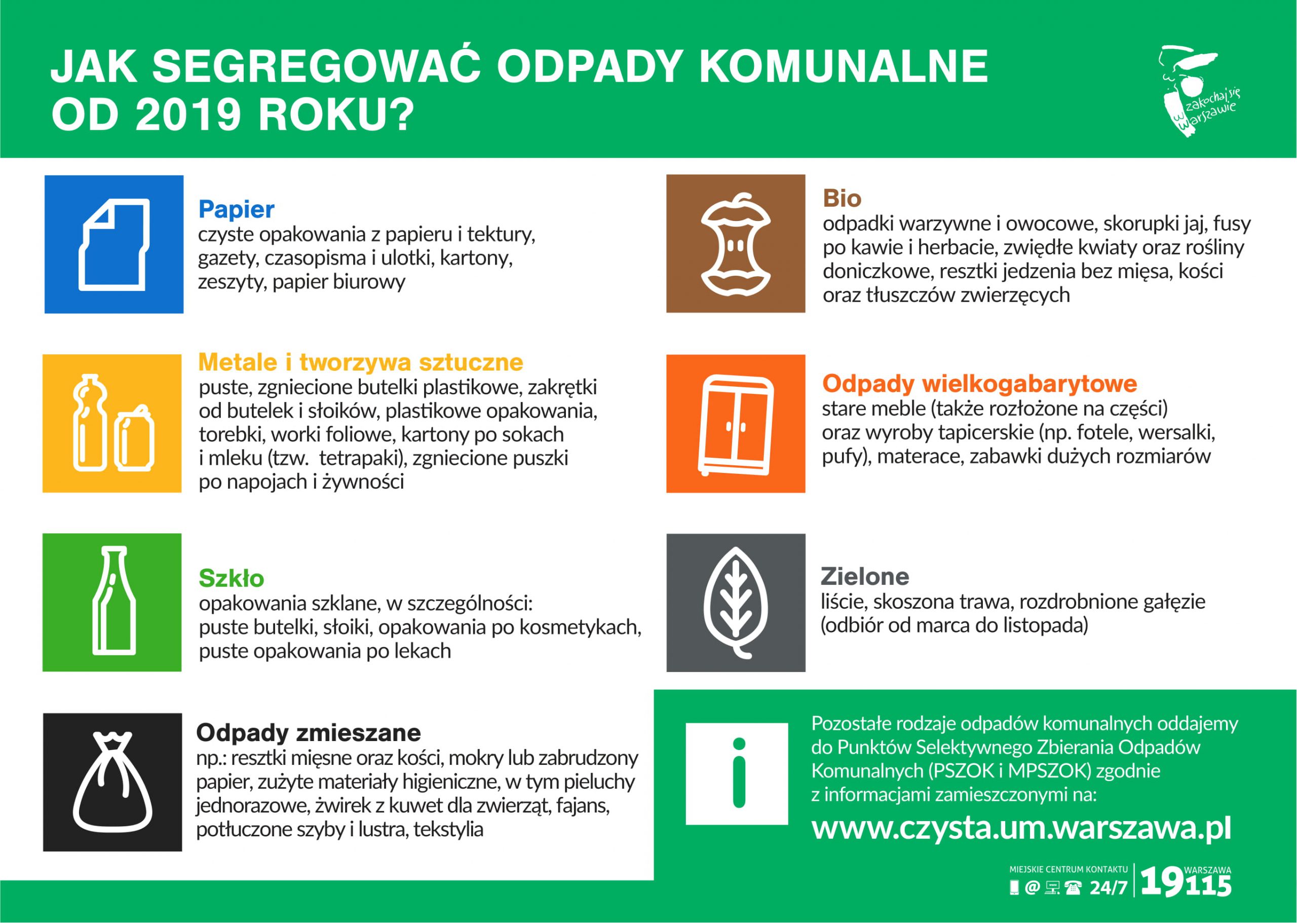 Zgodnie z Regulaminem utrzymania czystości i porządku na terenie m.st. Warszawy od 1 stycznia 2019 roku na terenie całej Warszawy obowiązuje system odbioru odpadów komunalnych, w którym mieszkańcy segregują odpady w podziale na 5 pojemników: