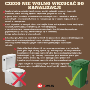 Zwracamy się do Państwa z apelem o właściwe i zgodne z przeznaczeniem użytkowanie instalacji wodno-kanalizacyjnej. Instalacja została zaprojektowana i wykonana, aby odprowadzać ścieki z Państwa mieszkań. Jeżeli jednak wraz ze ściekami płyną również inne odpady, mogą one spowodować niedrożność przewodów kanalizacyjnych i spowodować spiętrzenie ścieków.