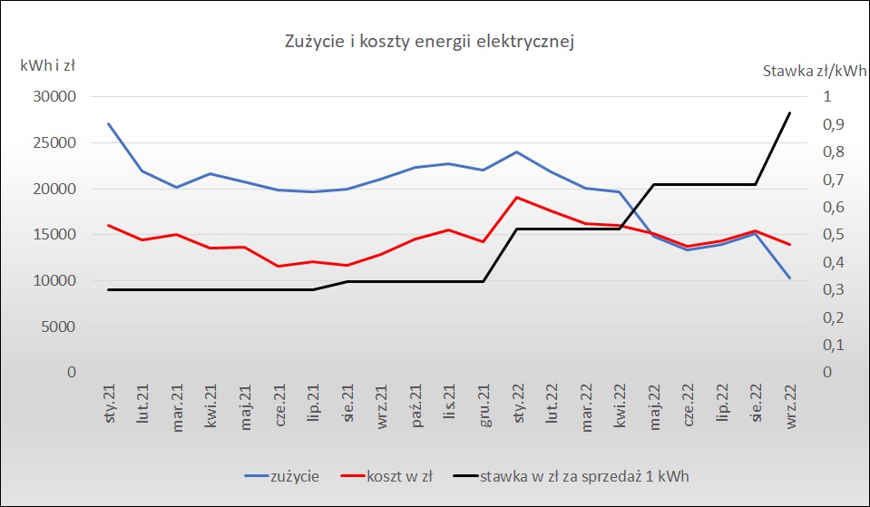 Powyższy wykres jasno pokazuje, że mimo wzrostu stawek za sprzedaż o 216 % (czarna linia), koszty pozostają na niezmienionym poziomie (czerwona linia), dzięki ogromnemu zmniejszeniu zużycia (niebieska linia). Obecnie prowadzona jest redukcja oświetlenia na klatkach schodowych oraz dalsza modernizacja na LEDy, ponieważ dalsze podwyżki cen są bardzo prawdopodobne. Na dzień dzisiejszy Wspólnoty Mieszkaniowe nie są uwzględnione w katalogu podmiotów, dla których planowane jest zamrożenie cen energii elektrycznej.