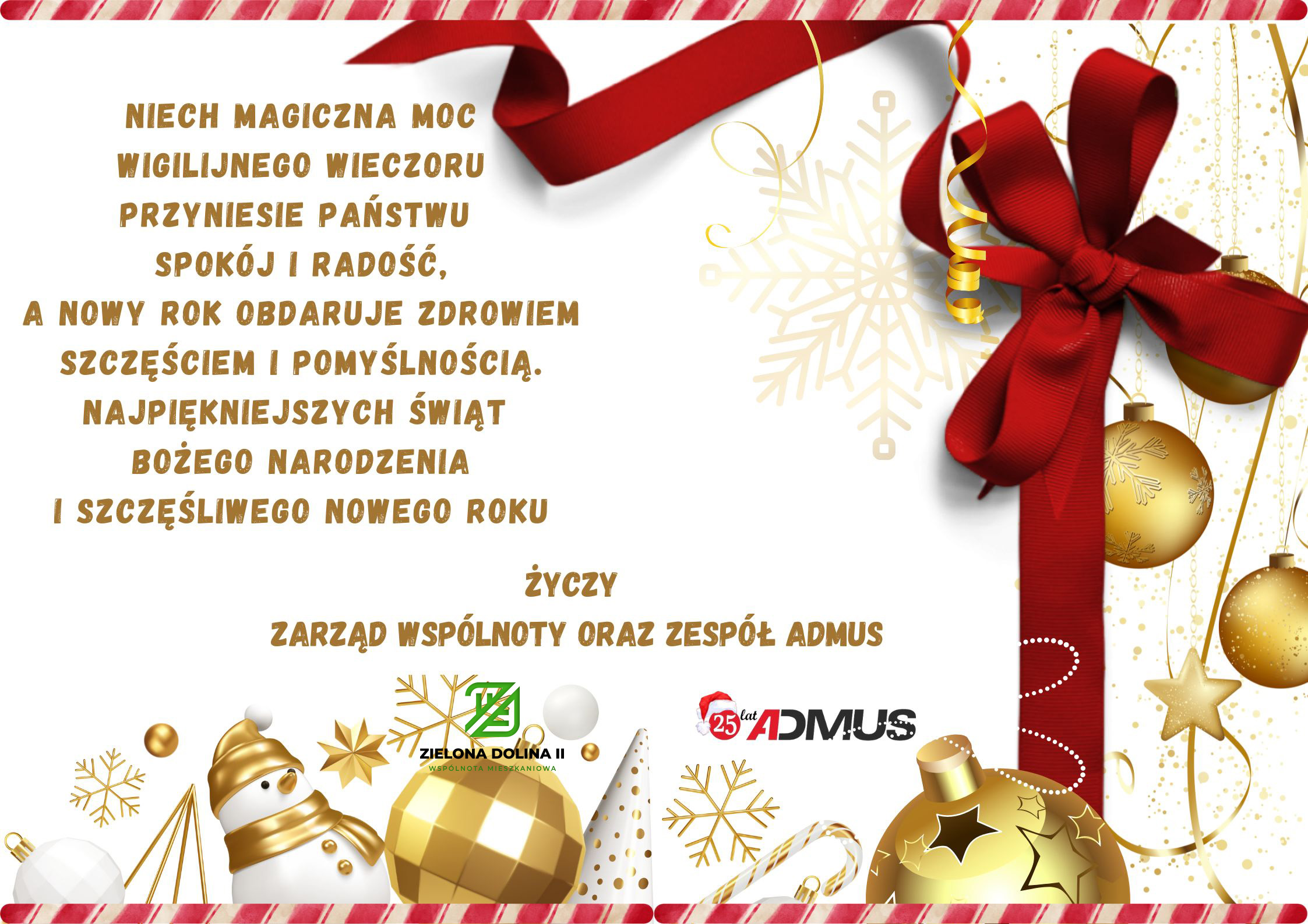 Życzenia Świąteczne Opublikowany 22 grudnia 2022 przez Niech magiczna moc wigilijnego wieczoru przyniesie Państwu spokój i radość, a Nowy Rok obdaruje zdrowiem, szczęściem i pomyślnością. Najpiękniejszych Świąt Bożego Narodzenia i szczęśliwego Nowego Roku życzy Zarząd Wspólnoty oraz zespół Admus.