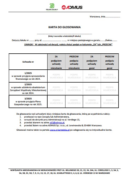 Głos można oddać w serwisie e-kartoteka.pl, przesyłając wypełnioną kartę do głosowania (dostępną tutaj) na adres zd2@admus.pl lub osobiście w biurze Administracji ul. Verdiego 13. Treść uchwał otrzymali Państwo 5 marca br. i są widoczne na e-kartotece na Tablicy Ogłoszeń.
