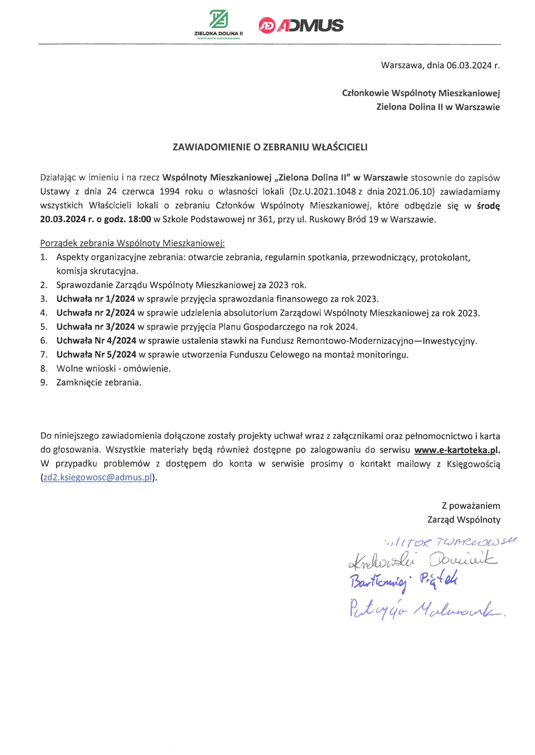Podstawowej nr 361, przy ul. Ruskowy Bród 19 w Warszawie (wejście od ul. Verdiego), odbędzie się zebranie Członków Wspólnoty Mieszkaniowej “Zielona Dolina II”.