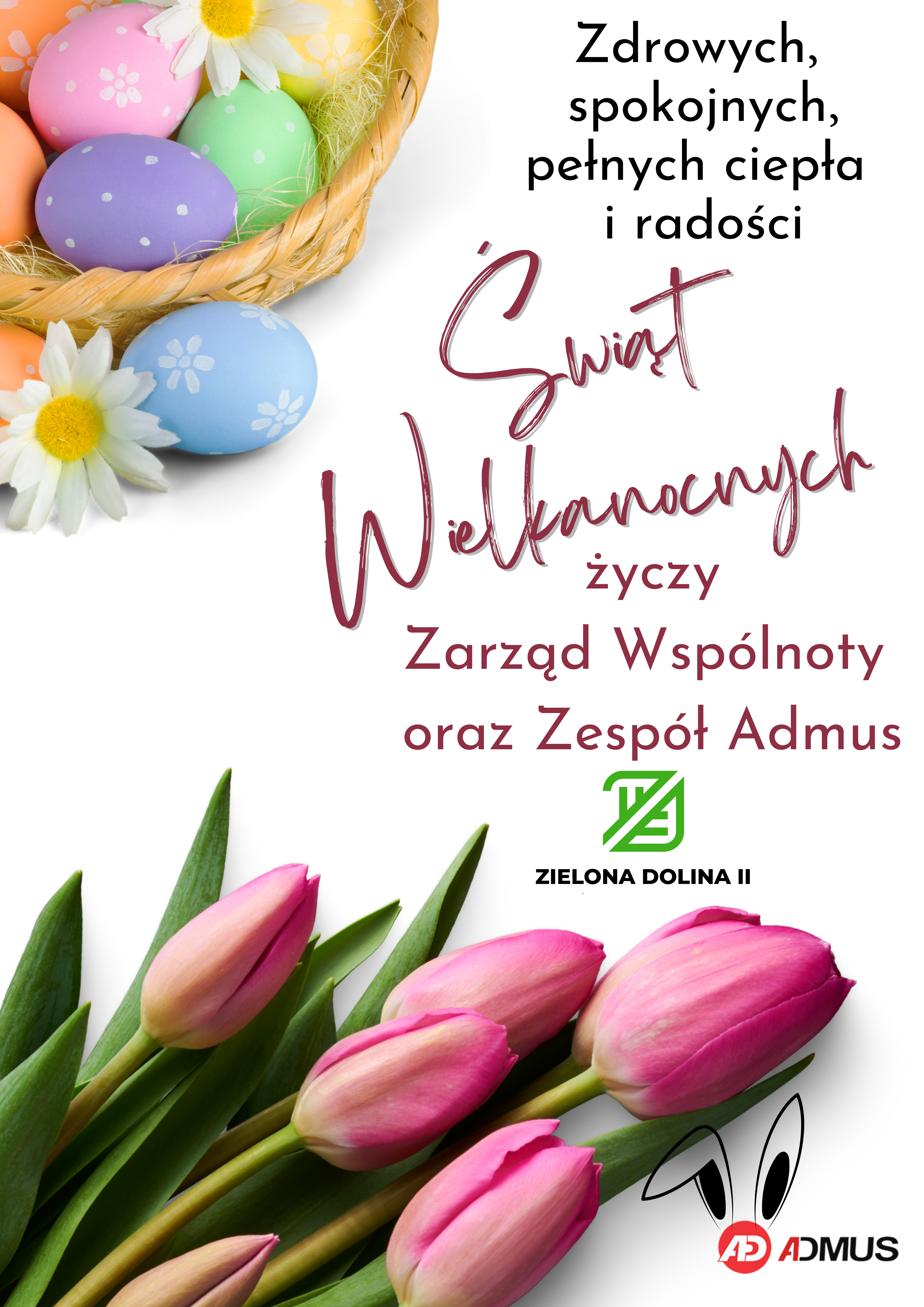 Życzenia Wielkanocne Opublikowany 29 marca 2024 przez WESOŁYCH ŚWIĄT, pełnych radości, spokoju i życzliwości życzy Zarząd Wspólnoty Mieszkaniowej Zielona Dolina II oraz Zespół Admus.
